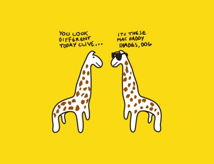 A cute design with a naive style that suits making fun of stereotypical talk of the street wise. And who is to say that when us humans aren’t poking our nose in their business, that giraffes aren’t mac’n it out in sweet new shades?