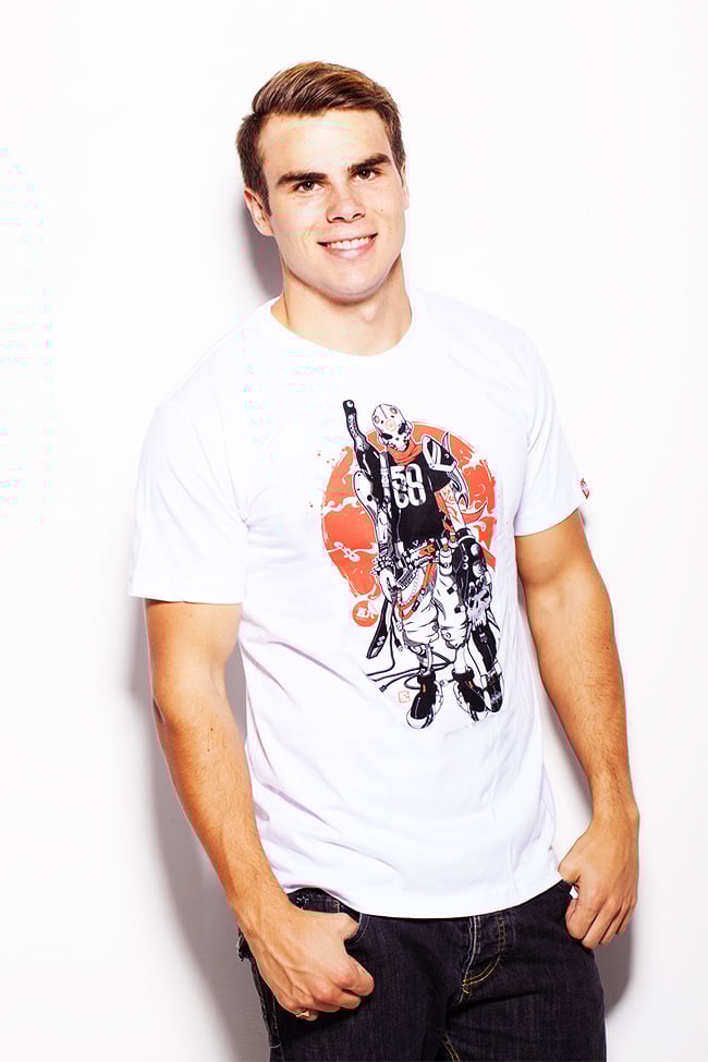 Some kind of hockey slash Karate Kid business happening here. Certainly unique in its design, this shirt won’t let you get too far without a gaping stare or two.