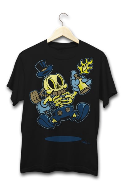 No more heroes anymore, you say? Well, these days it’s hard to find a good hero. Superman has left the building. Perhaps our last best chance at a decent future are the grafitti artists worldwide, and so the ghoul depicted on this shirt carries paint and a fork, demanding that we wake up.