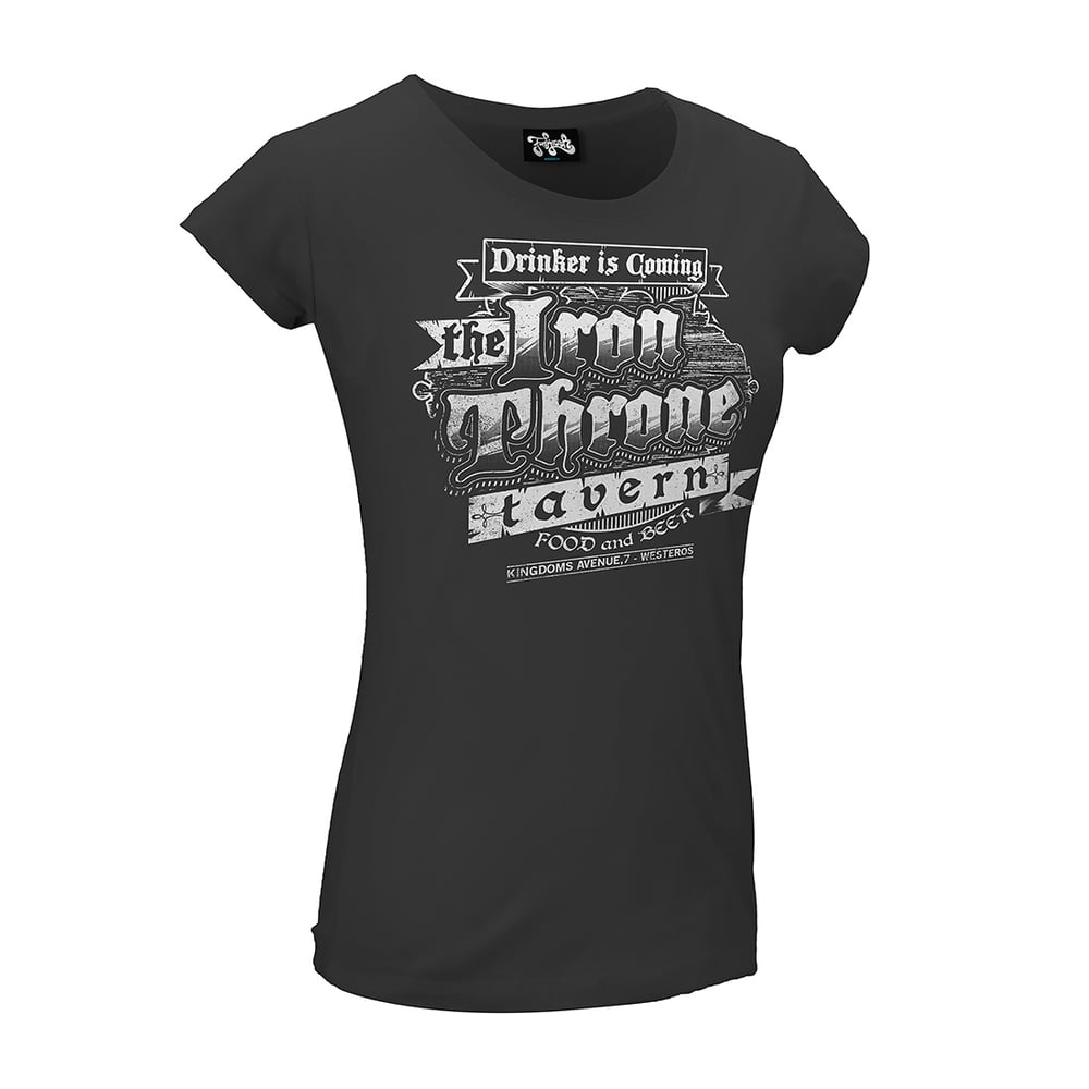 The Iron Throne Tavern has just opened in Kingdoms Avenue, Westeros. A Game of thrones parody tshirt for fans of the series. In black for both guys and girls. Drinker is coming.