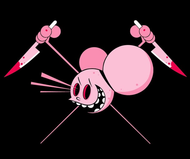 Mickey Mouse died of cancer, as you well know, but every now and then he returns from the grave with knives blazing, and sometimes he is pink in so doing. Still smiling and still getting his hooks into the little children, he will dispatch any and all who oppose him. Wear this shirt when you’re not sure what evil spirits lurk at your destination.